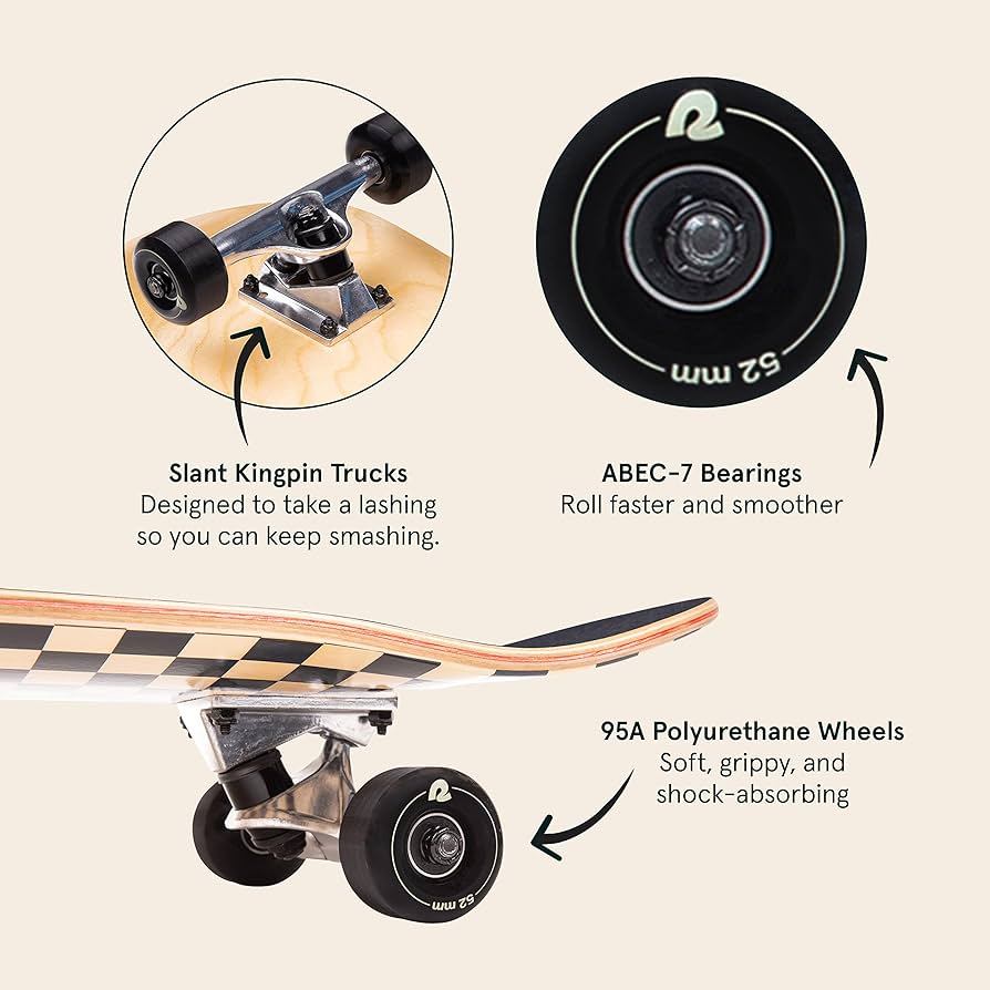 הדק עשוי מ-7 שכבות מייפל קנדי עמיד, מספיק חזק כדי לשאת עד 100 ק״ג ובנוי לשימוש יומיומי. טראקים מסוג Slant Kingpin וגלגלי PU בקשיחות 95A מספקים שליטה תגובתית ורכיבה יציבה על אספלט, בעוד שהמיסבים בעלי החזר אנרגיה גבוה שומרים על גלגול חלק.